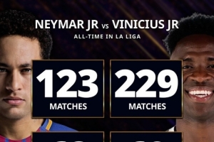 下一篇: 西甲数据对比:内马尔123场68球49助,维尼修斯229场69球46助
