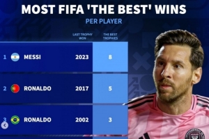 FIFA年度最佳球员获奖次数:梅西8次最多,C罗第二,齐祖大罗第三
