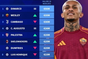 意甲边后卫身价榜:迪马尔科5000万欧继续第一,韦斯利升至第二