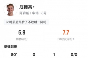 体育资讯1月4日讯 英超第20轮,阿森纳客战伯恩茅斯。厄德高首发出战,送出1次助攻,1次关键传球,还有3次抢断,评分6.9。