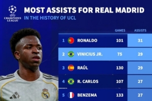皇马欧冠助攻榜:C罗31次居首,维尼修斯29次升至并列第二
